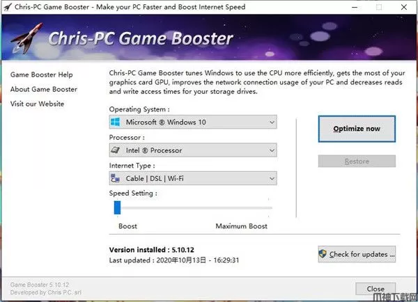 Chris-PC Game Booster是一款功能齐全的游戏性能优化软件。它并不是齿轮加速,它能获取到本地电脑的硬件信息,然后通过提高CPU、显卡和网络的性能来提高游戏的帧数和网速,至于你想提高多少,是可以自定义的,只需要一键就能达到你想要的效果;Chris-PC Game Booster主要通过修改处理器、修改启动、修改网络类型三种方式优化你的电脑,你需要知道这三个参数的意思才能调试电脑环境,从而提升电脑性能,优化应用程序启动速度,避免在玩游戏的时候出现延迟;如果你不满意Chris-PC Game Booster所做的修改,您可以随时按下恢复按钮,它会撤消它所做的任何更改,将其运送至原来的推荐值,有兴趣的小伙伴快来下载体验吧!