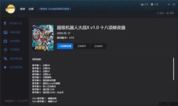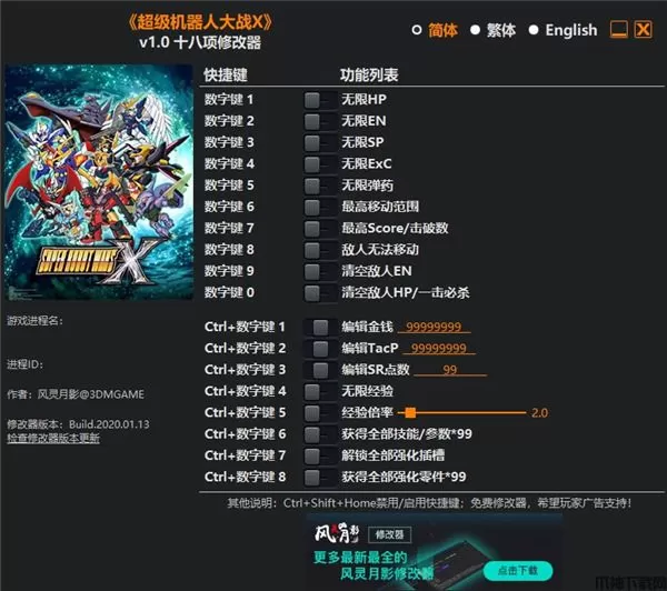 超级机器人大战X修改器是针对同名机甲战斗游戏打造的游戏修改工具,玩家下载使用后在游戏中可具备无限HP、无限EN、无限SP、无限ExC、无限弹药等十八项修改功能。