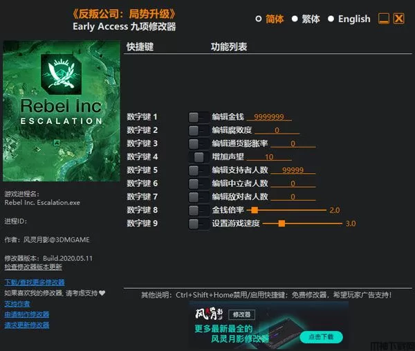 反叛公司局势升级修改器是由风灵月影大神针对政治/军事策略模拟游戏“反叛公司:局势升级(Rebel Inc:Escalation)”原创制作的一款游戏修改器。