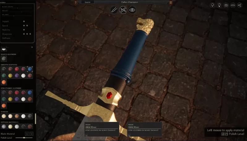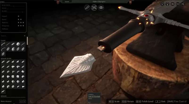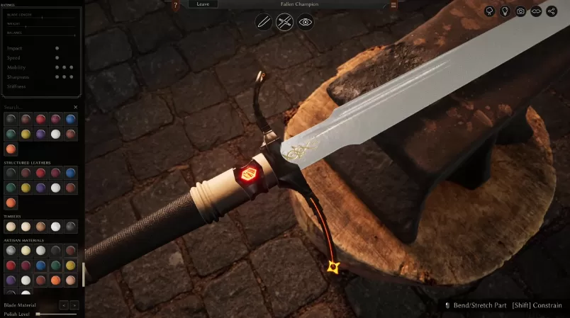 使用自由刀刃塑形与精细的模块化锻造系统,随心打造你心中的理想利剑。创造任意世界的武器,风格囊括从东方到西方,从历史经典到奇幻神兵,每一处细节都可以自定义,每一个部件都精雕细琢,尽显匠心。探索庞大的剑身组件与雕刻库。金属、皮革、木材、黑曜石、象牙等多种材料任你挑选。每一件作品皆独一无二。