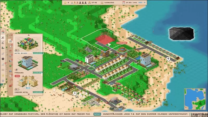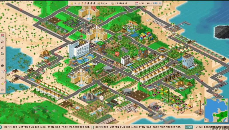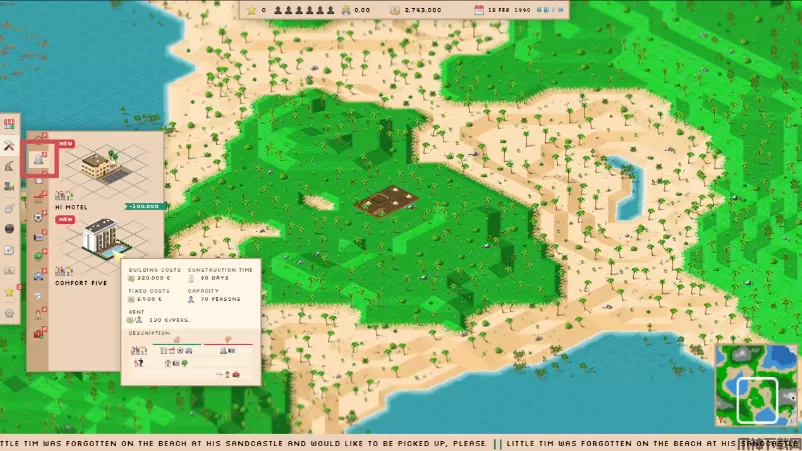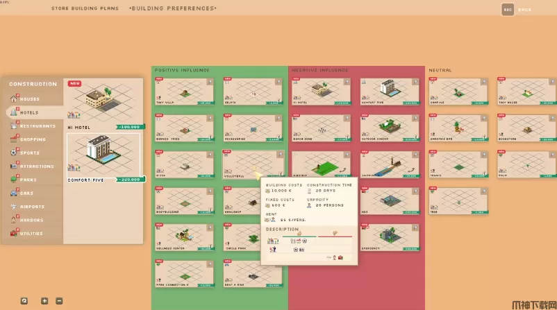 购买各种类型的新建筑。从房屋、酒店到餐馆、商店、公园景点等。在这里,您可以区分大众游客和豪华游客。拥有豪华游客的建筑能为您带来更多收益,但价格昂贵且容量较小。还要注意的是,大众游客和豪华游客对附近的建筑有不同的偏好。