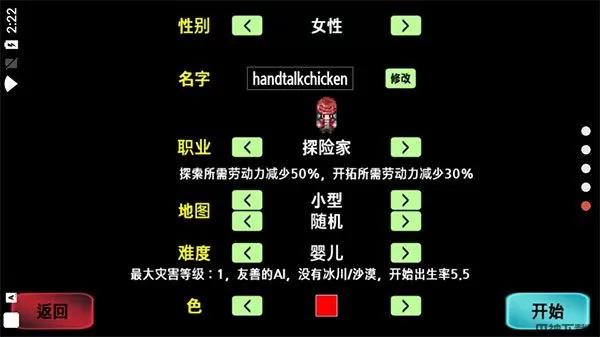 1、在本站下载安装大出产部落游戏后,点击“新游戏”开始。 2、选择游戏模式,新手建议先玩开拓,熟悉游戏。 3、创建角色,选择职业、地图以及游戏难度,然后点击“开始”。 4、点击“确认”。 5、在地图中心的头像就是角色本身,点击可以看到自己族群的状态以及人口数量等详情,每次开发都要关注好族群的人口数,数量越多,可以做的拓展就越多。