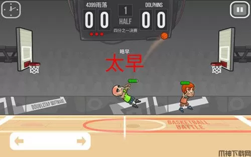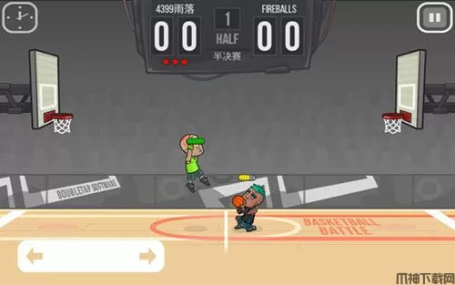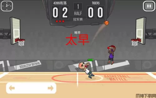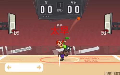 2、我们按住屏幕左下角的两个箭头可以控制角色移动,用手指按住屏幕右侧空白区域可以控制角色跳投,不过跳投的时候的注意一点,在主角跳到空中的时候就得放开手指,否者我们的角色是不会将篮球投出去的。