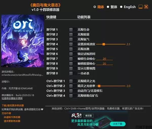 奥日与鬼火意志修改器是由大神风灵月影针对游戏“奥日与鬼火意志(Ori and the Will of the Wisps)”所制作的一款多功能游戏辅助修改器。它能够帮助用户更好的对奥日与鬼火意志这款游戏进行上手,能够在玩家遇到无法通过游戏关卡的时候进行帮助,奥日与鬼火意志修改器能够帮助您修改无限生命、无限能量、无限氧气、无限连跳在内的十四项游戏数据,让您在这款游戏通关行云流水,喜欢这款游戏的朋友赶紧下载使用吧!