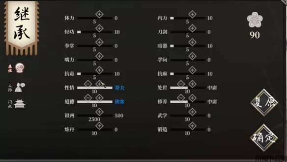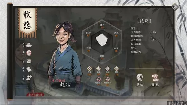 学问是很多武功的入门条件,嘴力对应战斗中的嘴炮,高了可以让对手放不出招。性情、处世、道德、修养在剧情投骰子时会有加成或者减值。技能需要在剧情和学习中获得。