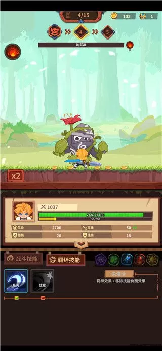 1、技能选择,挑战关卡时,首选攻击暴击攻速成长羁绊,其次是蓄力羁绊,辅以短暂力量,攻击提升等技能提升爆发,在boss释放大招之前干掉它。后期关卡成长略显吃力,可以配合劣势猛攻+不屈怒火,注意控制好血线。