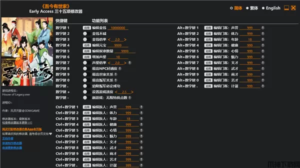 吾今有世家修改器是一款专门为《吾今有世家》游戏所推出的游戏数值修改器,它内置三十五项不同的修改功能,玩家将拥有金币不减、NPC关系最大化、招募叛军必定成功等设定,还可以编辑家族成员以及随从的声望、健康、武力等属性,帮助玩家进行一代代家族养成,经营家族产业并建造府邸和城池,提升家族势力,与世家合作争斗,最终成为权倾朝野的领袖。