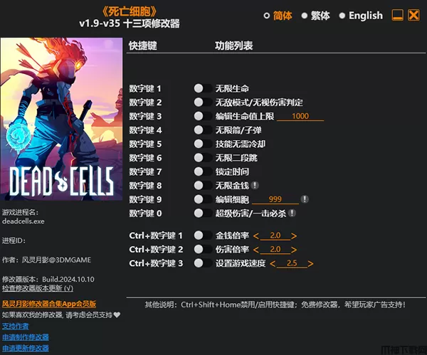 死亡细胞修改器是由3DM风灵月影针对于2D平台横版过关动作游戏“死亡细胞(Dead Cells)”制作的一款多功能修改器,它能为用户提供无限生命、无限箭/子弹、技能无需冷却和无限金钱等无敌功能,大大的降低游戏的难度,对于新手玩家来说是一款神