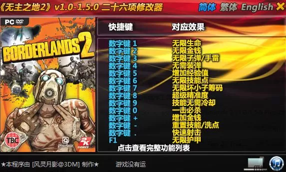 无主之地2修改器是一款专为RPG风格的第一人称射击游戏《无主之地2》所打造的多功能修改器,由风灵月影制作,具有一键实现开启无限坏小子筹码、快速射击、无限子弹/手雷、无限任务时间等功能,且修改器简单易用,玩家只需启动游戏、开启修改器即可进行修改。