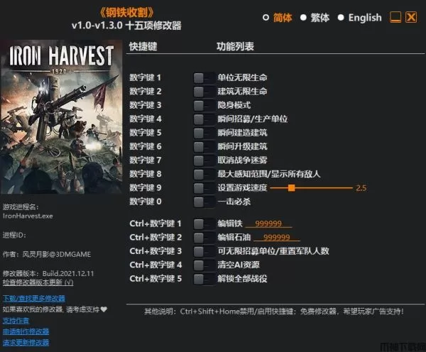 钢铁收割修改器是一款专为即时战略游戏《钢铁收割》所打造的多功能修改器,它能够帮助在游戏中修改包含单位无限生命、隐身模式、瞬间升级建筑、一击必杀、取消战争迷雾等十五项修改功能,可以帮助玩家战场中轻松消灭对手,获得更好的游戏体验。