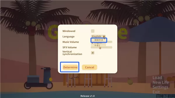 2、在Language一栏下拉选中简体中文,然后点击Determine即可。