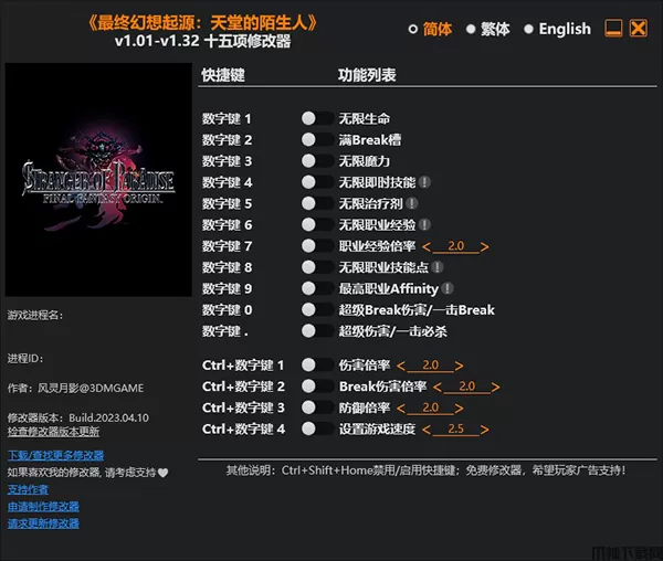 最终幻想起源修改器是专为同名游戏打造的游戏辅助工具,能够帮助用户解决游戏中所遇到的各种难题,轻松在这个世界进行战斗。并且该修改器功能非常强大,提供了十五项功能,可以根据自己的游戏体验适当开启,你只需启动游戏,运行修改器,按照修改器下方的功能按键操作即可在游戏当中享受修改功能的设定,有需要的朋友欢迎在本站下载体验。