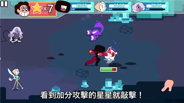 击光明史蒂芬宇宙是根据经典动画《史蒂芬宇宙》改编而成来的一款回合制冒险闯关游戏,采用了经典卡通的画风设计,巧妙的将休闲问答玩法与动作冒险玩法相结合,新颖独特的闯关玩法带给你一场独特的冒险之旅,游戏操作简单易上手,玩家需要与石榴石、珍珠、紫水晶等三位小伙伴一起前行拯救世界,在各种各样的主题风格中探索挑战,通过以策略和问答的形式展开,且每一个回合攻击战术模式不限定,可根据行动点数采取不同的战斗策略,以获得最强的的战斗输出,快速的完成挑战任务,从而成功解锁宝箱收集多种不同的辅助装备,提升英雄武力升级强化,学习新技能,体验不一样的游戏乐趣。