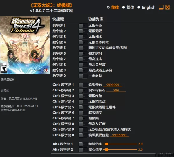 无双大蛇3终极版修改器是一款专为动作冒险游戏《无双大蛇3:终极版》所打造的多功能修改器,由风灵月影制作,它具有无限生命、最高友好度、无双极意、无限累积经验等修改功能,可大幅度降低游戏难度,给予玩家不一样的游戏乐趣。