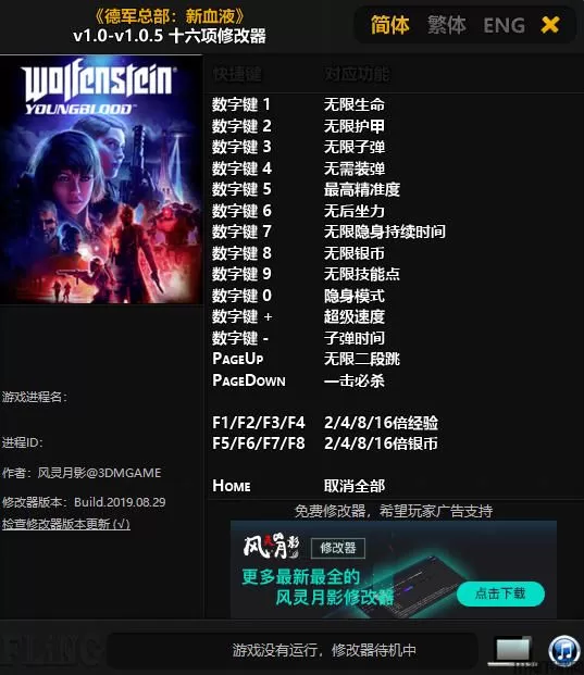 德军总部新血脉修改器风是一款专为第一人称射击游戏《德军总部:新血脉》所打造的多功能修改器,由风灵月影制作,具有无限生命、无需装弹、最高精准度、无限技能点、一击必杀、无限二段跳等修改功能功能,且修改器简单易用,玩家只需启动游戏、开启修改器即可