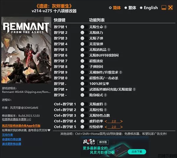 遗迹灰烬重生修改器是一款专为第三人称生存动作类游戏《遗迹灰烬重生》所打造的多功能修改器,由风灵月影制作。