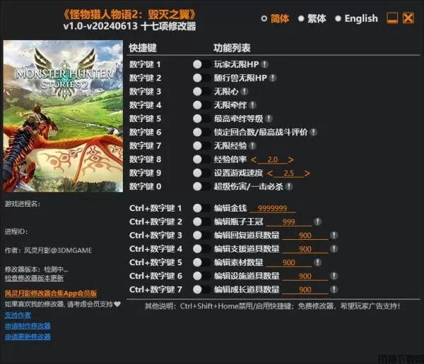 怪物猎人物语2破灭之翼修改器是一款专为日式动作冒险RPG游戏《怪物猎人物语2破灭之翼》所打造的多功能修改器,由风灵月影制作而成,可以修改游戏的各种属性,如玩家无限HP、随行兽无限HP、无限心等游戏内容,能够有效降低游戏难易程,且修改器简单易