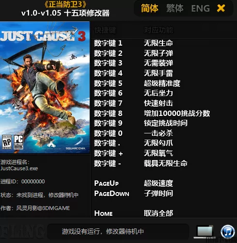 正当防卫3修改器是一款专为第三人称射击游戏《正当防卫3》所打造的多功能修改器,修改器具有无限生命、无限子弹、无限手雷、一击必杀、子弹时间等修改器功能,大大降低了游戏难度,让玩家拥有更加舒适的游戏体验,且修改器简单易用,玩家只需启动游戏、开启