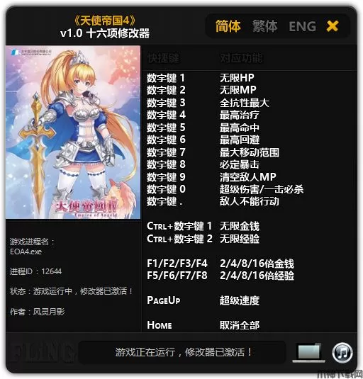 天使帝国4修改器是一款专为策略战棋游戏《天使帝国4》所打造的多功能修改器,由风灵月影制作,具有一键开启最大移动范围、敌人不能行动、最高治疗、无限HP等功能,且修改器简单易用,玩家只需启动游戏、开启修改器即可进行修改。