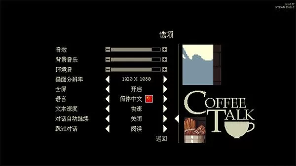咖啡谈话(Coffee Talk)是由Toge Productions制作发行的一款以咖啡师的角度倾听顾客的故事并为其制作暖饮的模拟游戏。游戏以一个全新的题材来描述一个一个奇幻色彩的现代社会,在游戏中你作为一家咖啡店的老板,游戏进行是会有许多的人来向你述说他们的故事,但是不只是人类身上发生的故事哦!咖啡谈话游戏采用了细腻的像素风格,形象地刻画了多个奇幻的种族的人物,并且这些不同种了的人物身上会有不同的故事,而已所需要做的就是向他们伸出援手,你要用你独特的帮助方式也就是帮他们调制咖啡,你需要根据不同人物故事来调制不同的咖啡或者其他饮料,以此来慰藉他们的心灵。整体来说,咖啡谈话游戏从一个别样的角度展现了现代社会大多数人的现实情境,游戏里你会有一场放松身心,发人深省的游戏体验。
