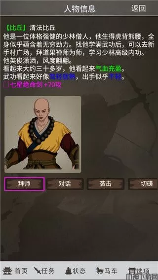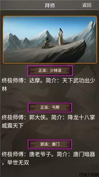 1、内置十大门派,百种绝学,能自由的挑选门派学习武功绝学。