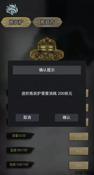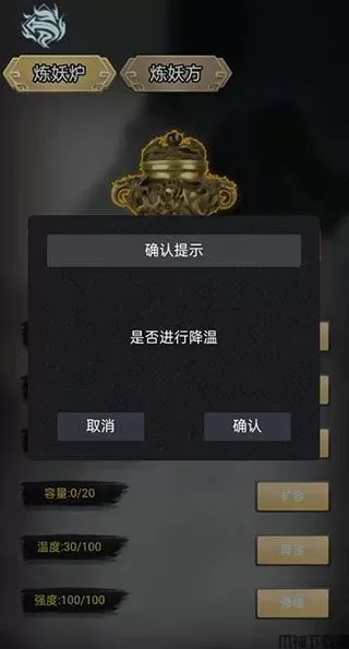 2、炼丹界面中的温度和强度怎么理解?你可以这么理解看过小说的都知道,炼丹要控制火候,一直炼丹肯定高温得降温,高强度的炼丹,丹炉强度也会破损。每次炼丹之前花一些妖元(妖元获取详见第一点),对温度项降温,对强度项修缮。即可继续炼丹。