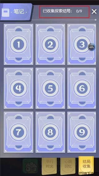6、其实在这个“结局收集”就已经暗示玩家了,这个游戏总共是有九种结局的,也就是说你每一次游戏的结果都是有可能不同的;