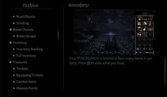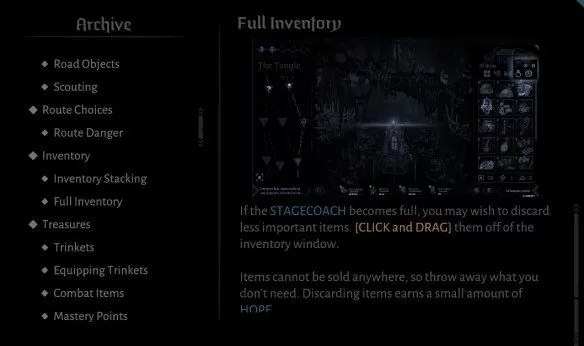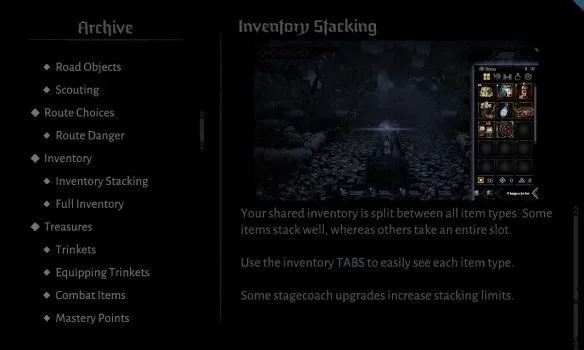 你的背包中所有类型的道具共享所有的格子数,一些道具可以堆叠,有一些则不能,点击右上角的五个符号可以切换不同的种类,从左到右分别是所有、战斗道具、酒馆道具、饰品和马车强化。