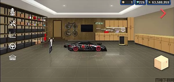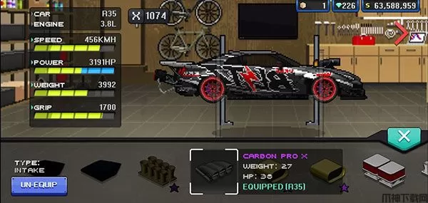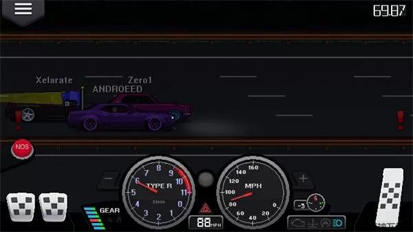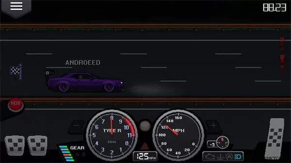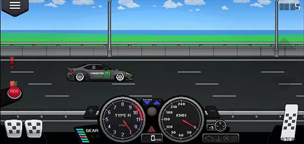 像素赛车手最大的特色就是有丰富的DIY改装元素,玩家可以在游戏中获取金币来购买升级车辆的一些零件,其中就有轮胎、引擎、车身,还有保险杠、助推器、轴承等等,然后利用这些零件来自由改装自己喜欢的赛车,也可以个性化自己的爱车,有不同颜色的车漆,当然看玩家自己的喜好来改装自己的赛车。另外,游戏采用横版平面式的比赛玩法,在游戏中玩家要像现实中那样靠着踩油门和挂档等方式来提高车辆的速度,并比你的对手抢先到达终点。