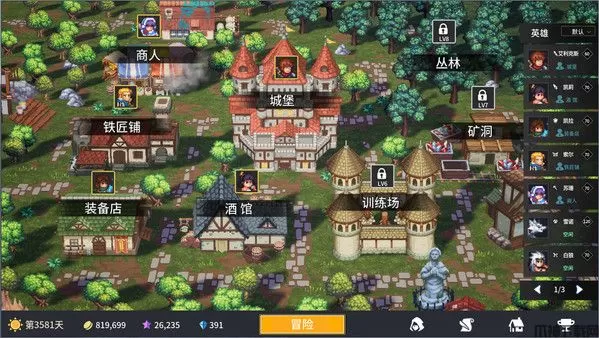 你不仅可以派遣英雄出去远征冒险,也可以在城镇为他们安排工作。将英雄安排到建筑中,可以提供给建筑不同的加成。城镇中有城堡、酒馆、装备店、铁匠铺、商人、训练场等各种建筑,丰富的城镇经营可以帮助你提升战队。