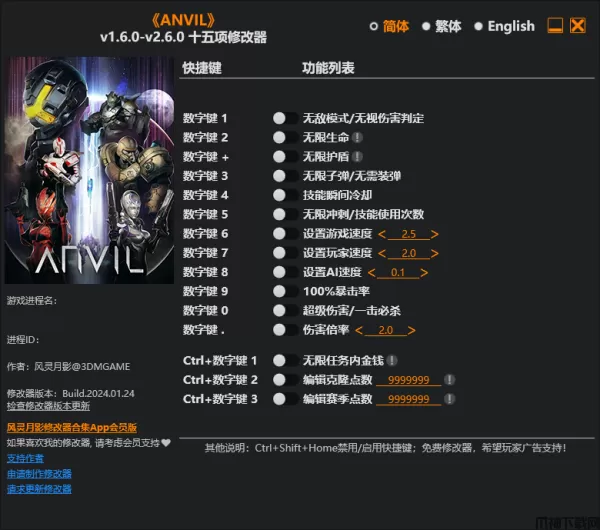 ANVIL修改器是一款专为多人合作科幻RPG动作射击游戏《ANVIL》所打造的多功能修改器,该修改器支持无敌,无限生命,无限子弹,秒杀等功能,让你能够轻松通过关卡!且修改器简单易用,玩家只需启动游戏、开启修改器即可进行修改。