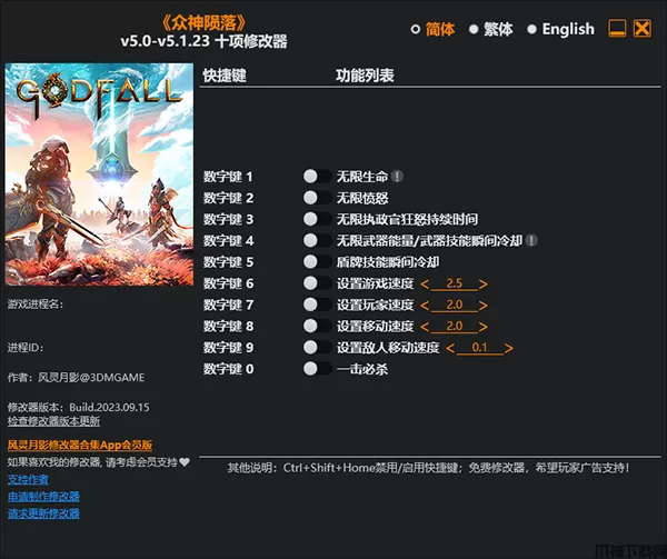 众神陨落修改器是一款专为第三人称打怪杀戮类奇幻游戏《众神陨落》所打造的多功能修改器,它提供无限生命、无限愤怒、无限执政官狂怒持续时间、无限武器能量、盾牌技能瞬间冷却、游戏速度、一击必杀等多项修改内容,且修改器简单易用。