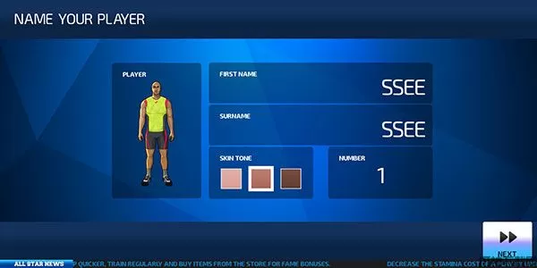 9、新手引导结束后,自定义角色的姓和名,点击右下角NEXT按钮来正式开始比赛。
