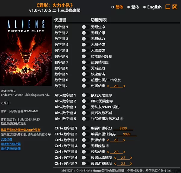 异形火力小队修改器是一款专为第三人称射击生存游戏《异形火力小队》所打造的多功能修改器,由风灵月影制作而成,具有无限生命、无限护甲、无限体力、无限子弹等二十三项修改功能,且修改器简单易用,玩家只需启动游戏、开启修改器即可进行修改。