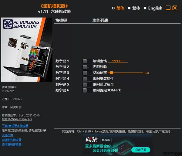 电脑装机模拟器修改器是一款专为电脑装机模拟游戏《装机模拟器》所打造的多功能修改器,它提供编辑金钱、无限经验、奖励倍率、瞬间清理灰尘等修改功能,能够帮助玩家获得丰富的金钱来购买需要的道具,体验更佳的游戏乐趣!