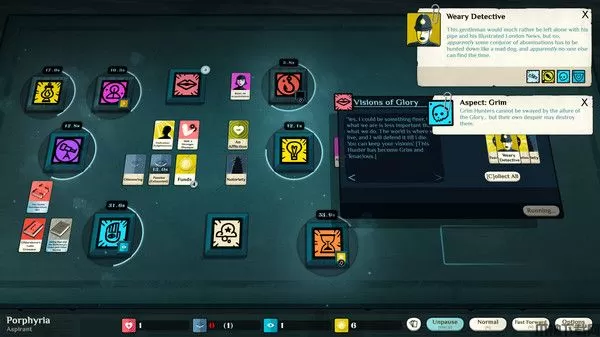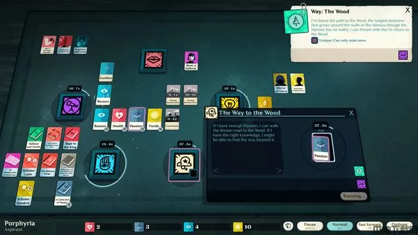 这个游戏没有太多的图像,大部分都是通过卡片进行的,所以玩的时候主要的操作就是拖动卡片到你想要的位置然后点按钮。除了卡片之外,还有另一种非常重要的东西,叫做“行动”。行动就是在桌面上的正方形框。行动分为主动式行动和被动式行动,主动式的行动需要你往里面拖一些符合要求的一张或多张卡片,然后点击开始,就会进行那个行动。比如说工作(一个手的标志),你把你想用来工作的技能或者属性或者职业拖进去然后点开始就可以了,一段时间以后会自动给你结果,比如说钱和别的东西。被动式行动不需要你点击按钮就会自动开始,并且一般会自动进行并且给你结果。