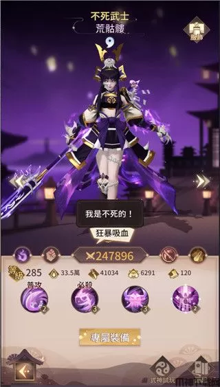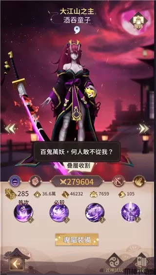 酒吞童子:魔,普攻可攻击血量最低的敌人,并获得增加伤害的酒气,被击和击杀敌人也都会追加酒气,酒气最多30层(酒气增加有时会多层),必杀会攻击血量最低的敌人4次,成功击杀会追加全体范围攻击,算是伤害可以慢慢成长且有效针对血量少的敌人。专武可在战斗开始就获得5层酒气,专武等级提高可以提高必杀伤害和开场改为获得8个酒气,并且在必杀击杀对方后禁止对方复活。