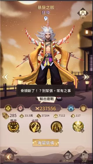 狂骨:山林,能附加易伤和我方进行普攻协同攻击,攻击有特效或伤害高比较能产生效益,但有些角色会标准协同不会触发。专武增加协同率,专武等级增加则增加协同率(普攻100%)和协同人数(必杀可再增加2~3人),必杀时每当有协同成功的友方,就可额外对目标造成生命上限伤害5%。玩起来很有围欧和大乱斗的感觉,专武等级升满后伤害非常可观。