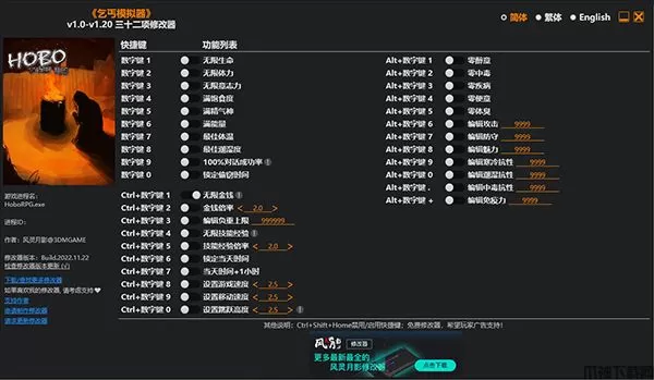 乞丐模拟器修改器是一款专为《乞丐模拟器》游戏所打造的多功能修改器,功能强大,提供无限生命、100%对话成功率、编辑负重上限、锁定当天时间、设置跳跃高度、编辑中毒抗性等三十二项功能,协助你轻松通关。