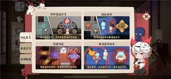 普通学员需通过完成各种任务收集情报,每个人的任务都略有不同,其中部分还需要多名学员携手完成,任务内容包括修复路牌,大胃王试炼、弓道试炼、泡温泉、打包盒饭等等。