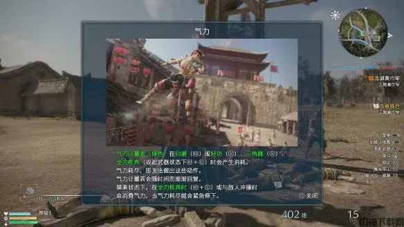 4、气力和回避系统:游戏中的绿色计量条就是气力,这个系统和“怪物猎人”、“黑暗之魂”等系列相似,人物进行加速奔跑、回避和轻功时都会消耗。在骑乘状态下加速奔跑和冲撞敌人也会消耗气力槽,气力槽消耗完后马匹会有抬起前脚的硬直动作,所以建议气力条尽量不要消耗完。
