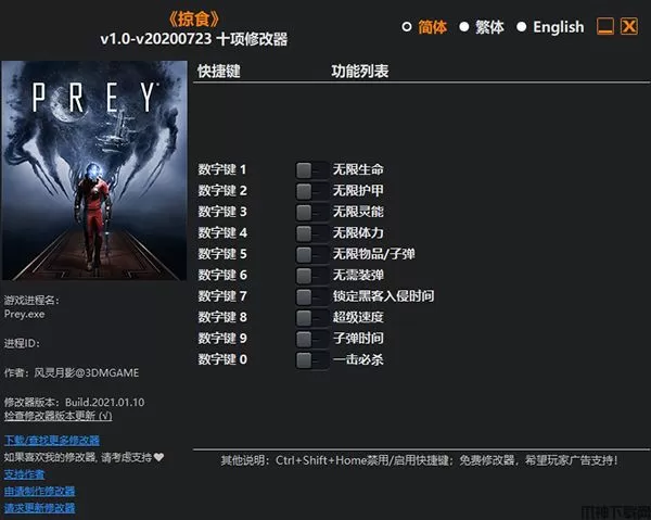 掠食修改器是一款专为科幻题材的第一人称角色扮演游戏《掠食》所打造的多功能修改器,由风灵月影制作,提供无限生命(生命值减少时生效)、一击必杀、锁定黑客入侵时间、无限物品/子弹等修改功能,提高玩家的体验乐趣!且修改器简单易用,玩家只需启动游戏、开启修改器即可进行修改。