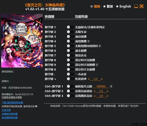鬼灭之刃火神血风谭修改器是一款专为《鬼灭之刃火神血风谭》游戏所打造的多功能修改器,它还能够为玩家们提供许多修改功能,支持无限生命、满觉醒槽、满支援槽、清空对手技能槽、清空对手支援槽等十五项修改功能,全方位满足玩家的游戏需求,大幅度减小游戏的难度。同时鬼灭之刃火神血风谭修改器还支持中文、繁体、英文三种语言,安全无毒无广告!
