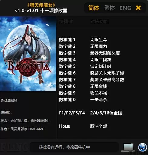猎天使魔女修改器是一款专为《猎天使魔女》电脑游戏所打造的多功能修改器,一键实现开启奖励关卡最高分数、武器无限耐久度、无限魔力、一击必杀等功能,大大降低了游戏难度,让玩家拥有更加舒适的游戏体验! 功能按键介绍数字键 1 - 无限生命 (被攻击