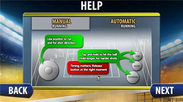 2、游戏开始前,对于那些像小编这样连网球基本规则都不知道的小白玩家,特意准备了系统帮助和训练模式,训练前会为我们展示一些基本的打法。训练的时候还为我们提供了是自动奔跑还是自己控制角色奔跑的选择,使得整个游戏的可玩性大大增加了。
