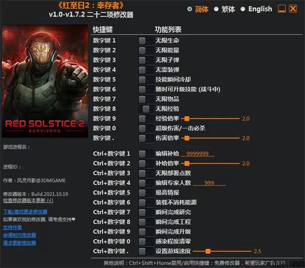 而今天为玩家带来了由风灵月影制作的红至日2幸存者修改器,其中包括:无限生命、无限能量、无限子弹、无需装弹、技能瞬间冷却、随时可升级技能(战斗中)、无限物品、无限经验、经验倍率、超级伤害/一击必杀、伤害倍率等功能,让你可以更快上手游戏,提升游戏乐趣,喜欢红至日2幸存者二十二项修改器的朋友就赶紧试试吧。