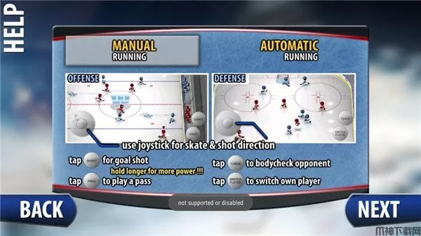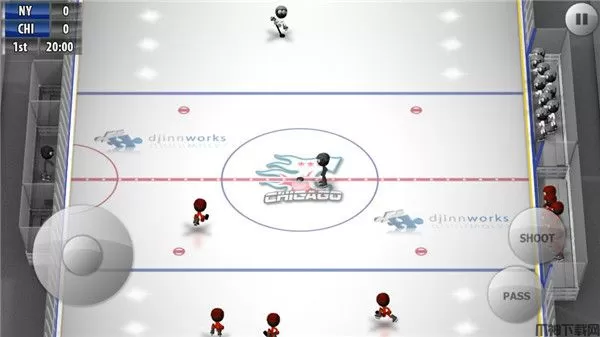 火柴人冰球游戏在玩法上采用了两种操作方式,其中一种是比较常规的虚拟摇杆+按键的组合,这种操作的好处在于易于上手,当你处于进攻或者防守时技能按键是会相互切换的,在进攻时的按键是传球和射门,在防守时则变成了变换光标和断球。