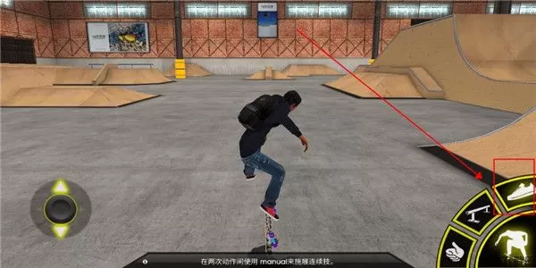 3、这个则是碾磨按键,主要栏杆等地形按住此键可以进行滑行,将此键和方向键组合使用,可以施展不同的平衡动作