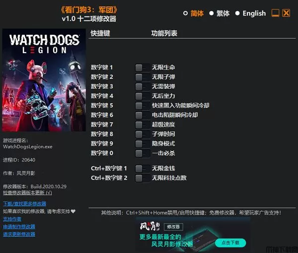 看门狗军团是一款第三人称射击角色扮演游戏,之前本站给大家带来了这个款游戏,而本次小编给大家带来的是看门狗军团修改器,该软件能够修改游戏里的一些数据,比如:无限生命,无限子弹,无后坐力,快速黑入功能瞬间冷却,电击陷阱瞬间冷却,超级速度,隐身模