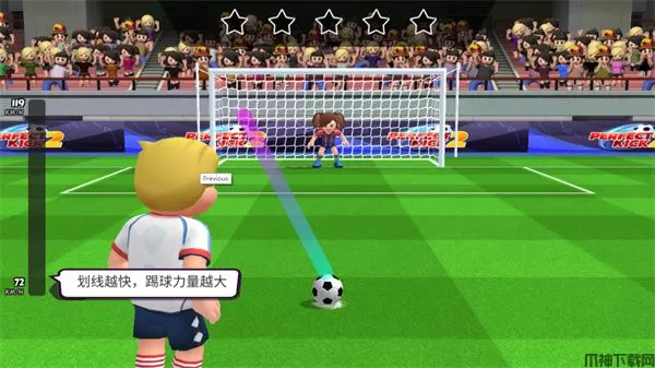 2、向球门滑动手指,球会被踢向划的方向,划线越快,球的速度就越快,左侧的速度表会体现出球速。